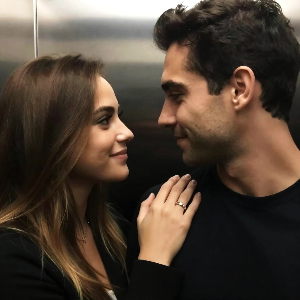 Photograph of a man and woman in an intimate moment. Man with dark hair, side profile, gazes at woman. Woman with light brown hair, smiling, touches his shoulder. Both wear dark clothing. Background includes metallic, reflective surfaces. Woman's hand with gold ring on man's chest. Close, warm interaction.