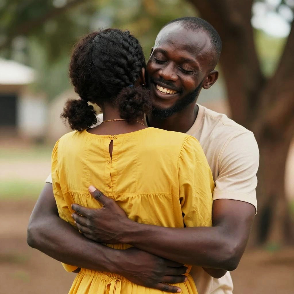 Portrait of a smiling young dark-skinned woman with curly hair hugging a dark-skinned man with a beard and mustache. Both wear yellow shirts and pose against a natural outdoor background under daylight. The man has his eyes closed, appearing relaxed.
