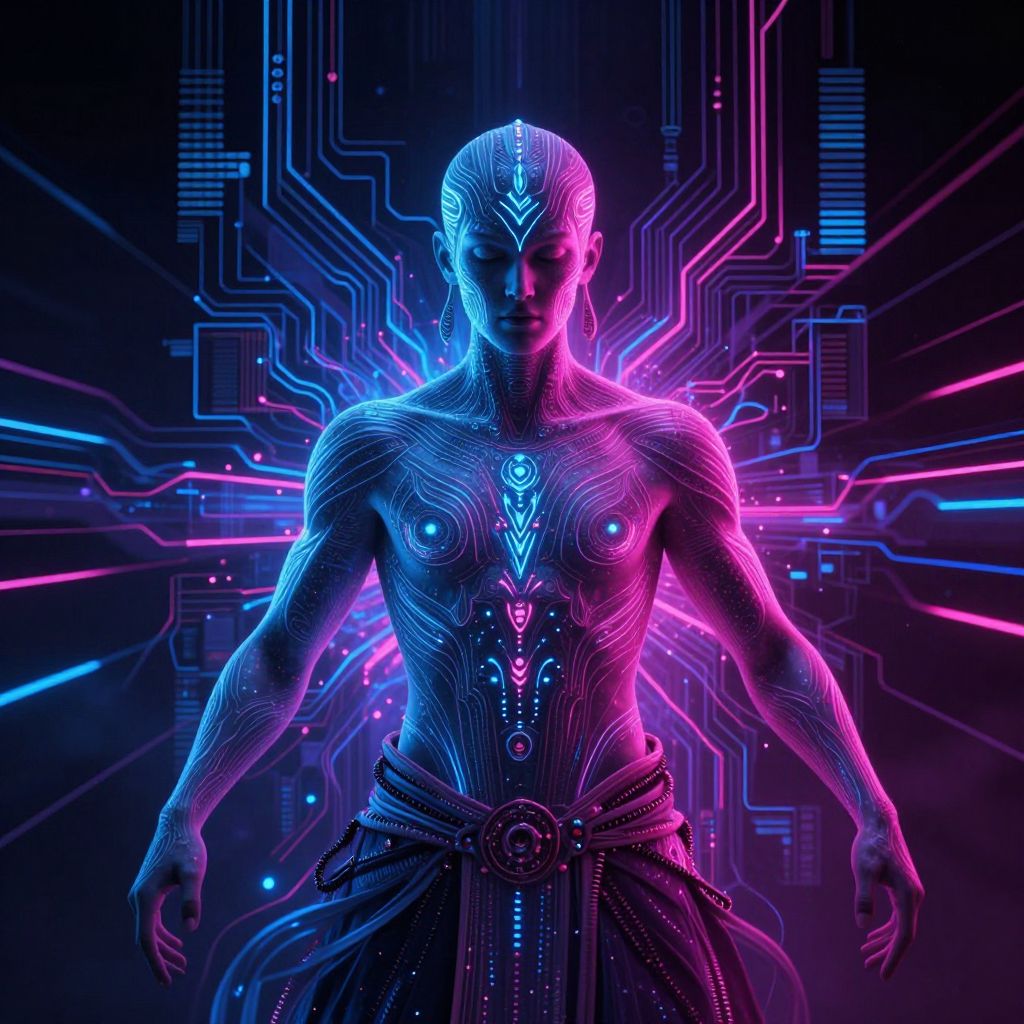 Jemini as a powerful techno-shaman merging with digital circuits, abstract data streams flowing through a dark void, neon blue and magenta highlights, futuristic tribal symbols glowing on skin, complex wireframe background, dynamic composition with a sense of energy and mystique.