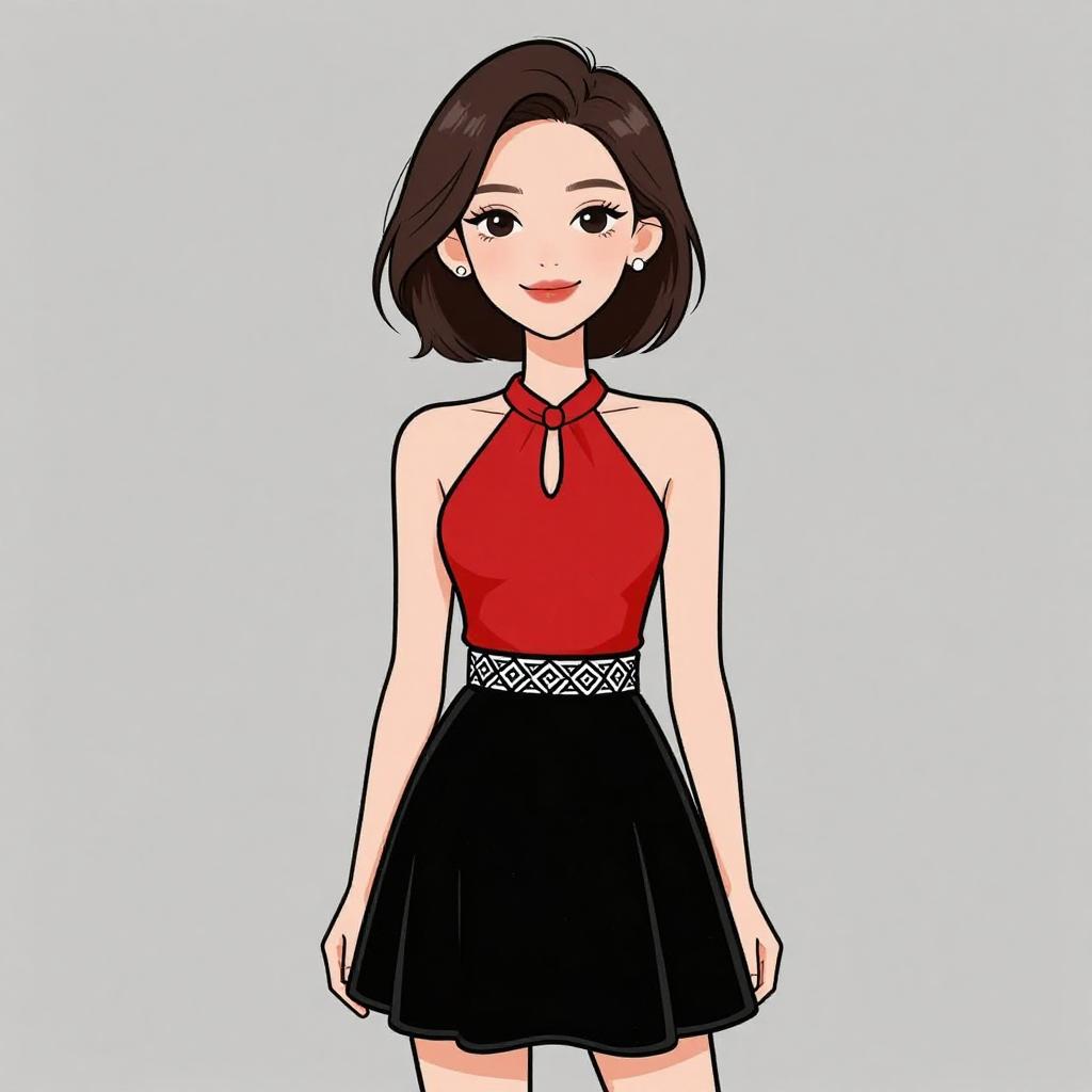 Woman with pretty face and pretty hair. smiling Woman, chic, halter top in vibrant red, sleeveless, neck fastening, contrast with black velvet skater skirt, waistband embellished with white and black geometric pattern, short hemline, minimal jewelry with stud earrings. --sref 1467