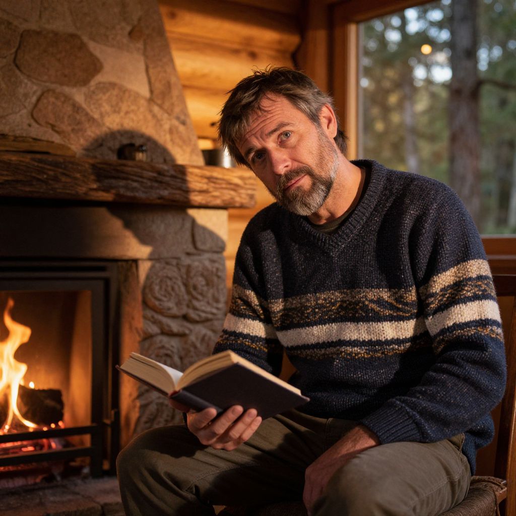 A photograph of a middle-aged man with a beard and short, dark hair, sitting by a stone fireplace. He wears a navy blue, knitted sweater with beige and white stripes, and brown pants. He holds an open book in his hands, looking up with a slight smile. The warm, orange glow of the fire illuminates his face and the wooden logs of the cabin interior. A window in the background reveals a blurry, dark forest outside. The scene exudes a cozy, rustic atmosphere.