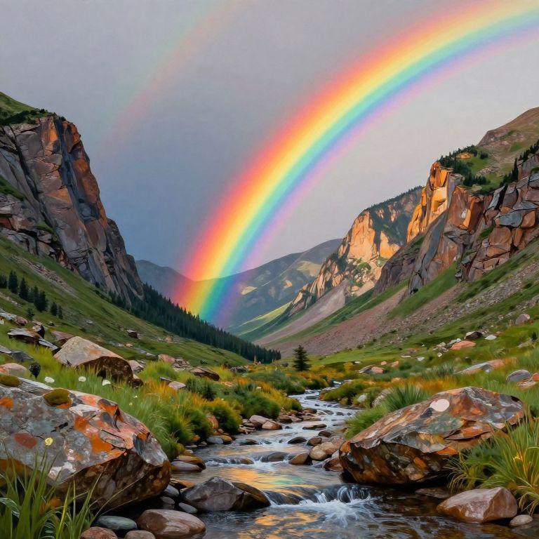 Photograph of a vibrant rainbow arching over a rocky mountain valley with a flowing stream, surrounded by green grass and pine trees.