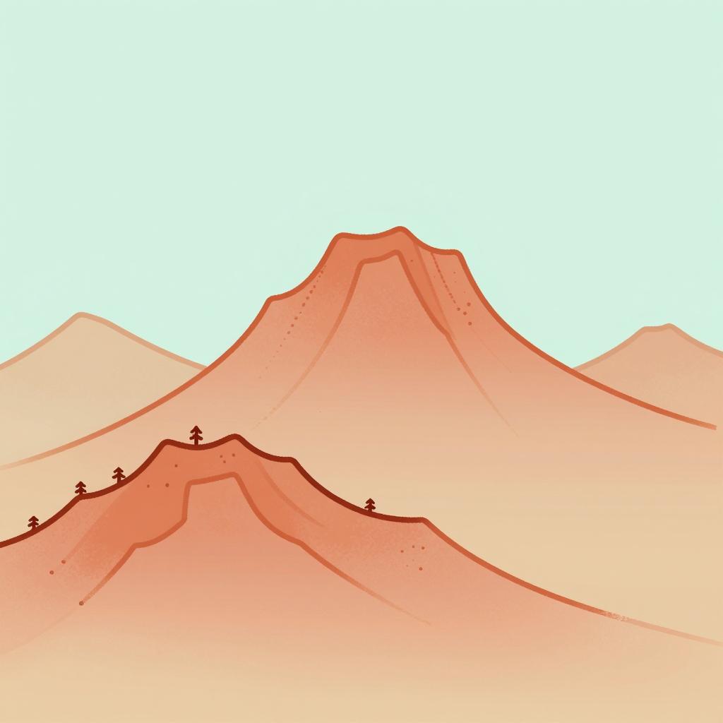 Digital illustration of a nostalgic mountain landscape in colored cartoon style. Features softly shaded peaks in light crimson, light amber, and light orange hues against a pale teal sky. Includes minimalistic tree silhouettes and smooth ink-wash style shading, evoking a serene and peaceful atmosphere.