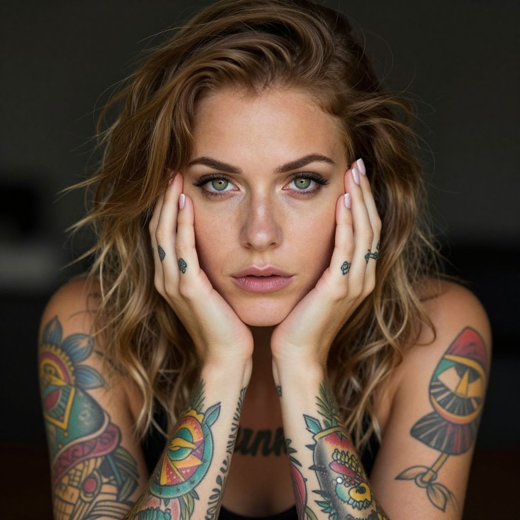Photograph of a tattooed woman with light brown, wavy hair, looking directly at the camera with intense green eyes. She rests her hands on her cheeks, showing off intricate, colorful tattoos on both arms. Her expression is serious and focused. The background is dark and blurred, making her and her tattoos stand out. The lighting highlights her facial features and tattoos.
