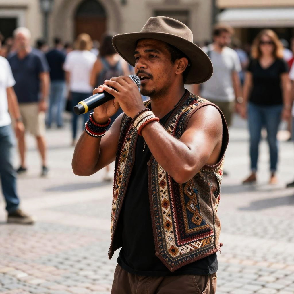 Realistic photo.A bold depiction of a melodic street performer wearing a crafted vest and wide-brimmed hat, with handmade bracelets, set against a cobblestone plaza filled with people. realistic photo