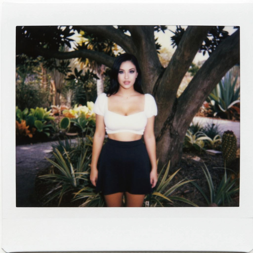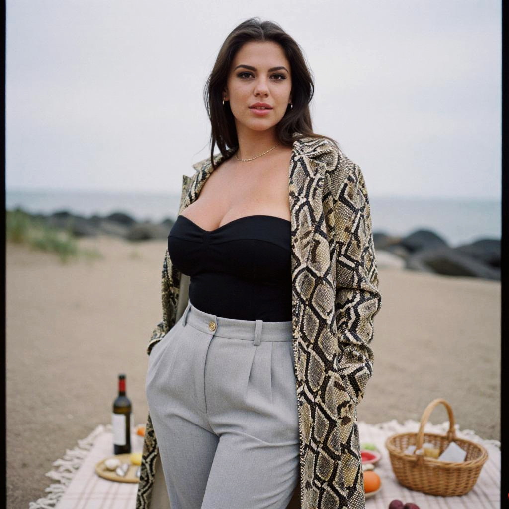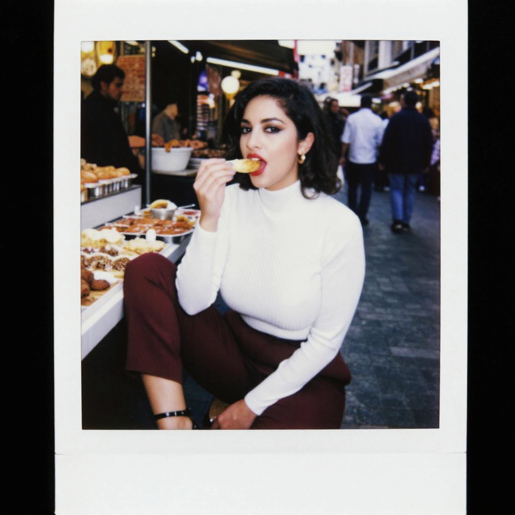A woman in a ribbed white turtleneck and burgundy tapered trousers, black ankle strap heels, captured in a polaroid instant camera style, enjoying gourmet street food at the Istanbul bazaar. Sexy. Pretty face and beаutiful eyes. Big breasts