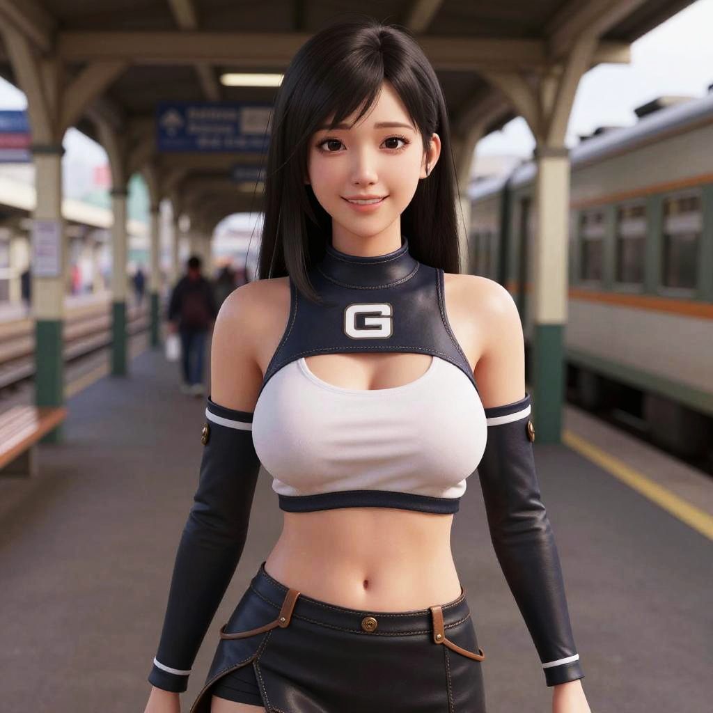 This is a digital CGI image of an attractive young Asian woman with long black hair and fair skin, standing on a train platform. She is wearing a black and white sports-inspired outfit with a black sleeveless crop top featuring a white letter "G" on her chest, exposing her midriff. Her black arm sleeves and black high-waisted shorts with brown buttons add a sporty touch. The background shows a blurred train station with a train on the right and other passengers in the distance. The platform has benches and signs, with a roof structure overhead. The image has a realistic, yet slightly stylized appearance.