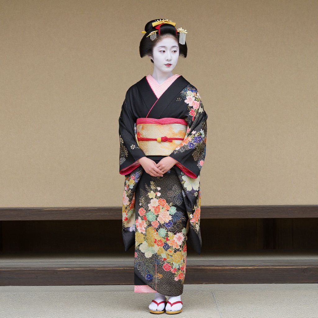 "Traditional Japanese Geisha Dress, woman in a kimono dress standing in front of a wall"