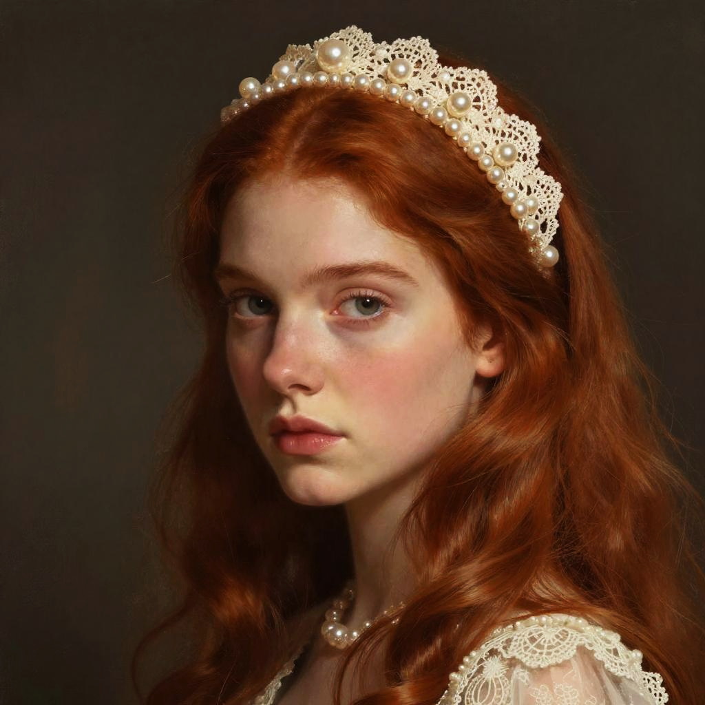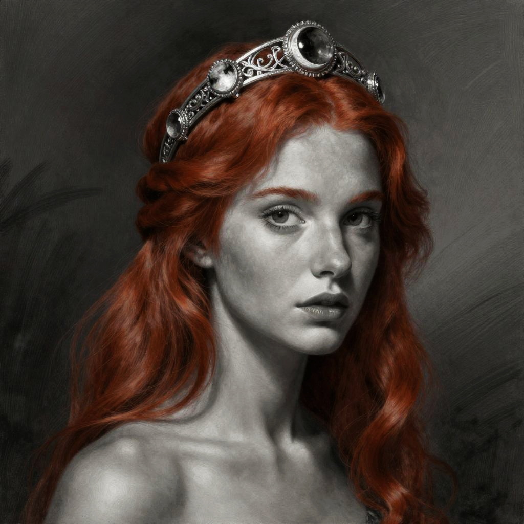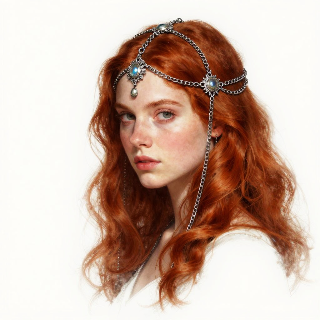 Beautiful line art of a young red hair woman wearing an ornate chain head jewelry, intricate, elegant, highly detailed, digital painting, artstation, concept art, smooth, sharp focus, art by krenz cushart and artem demura and alphonse mucha, dynamic lighting, ultrarealistic, cinematic, octane render, 8 k
