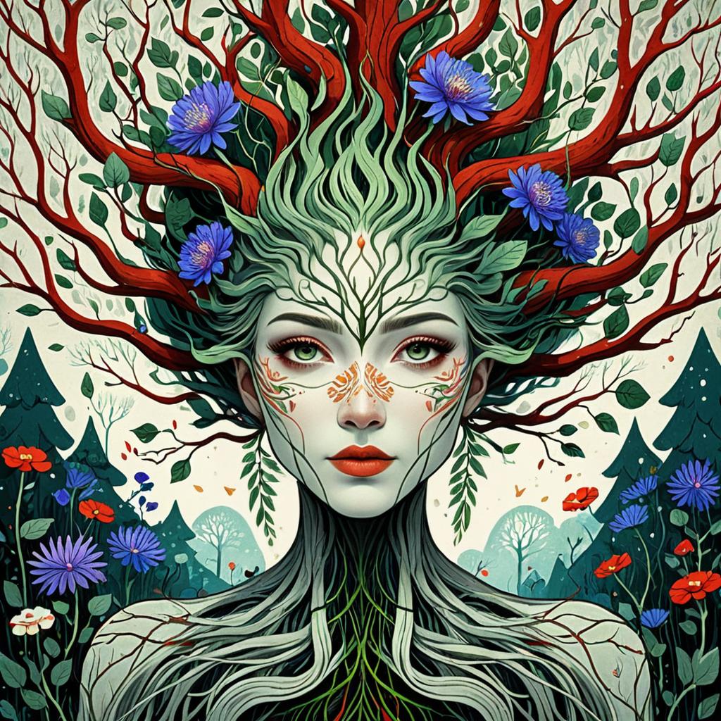 Anthropomorphic Tree Lady with Vibrant Roots and Flowers