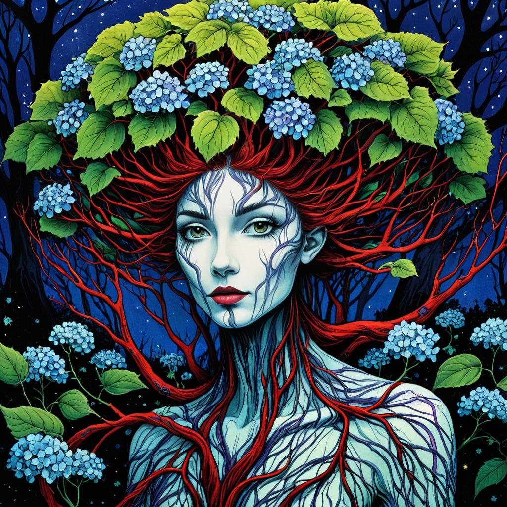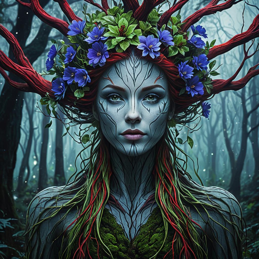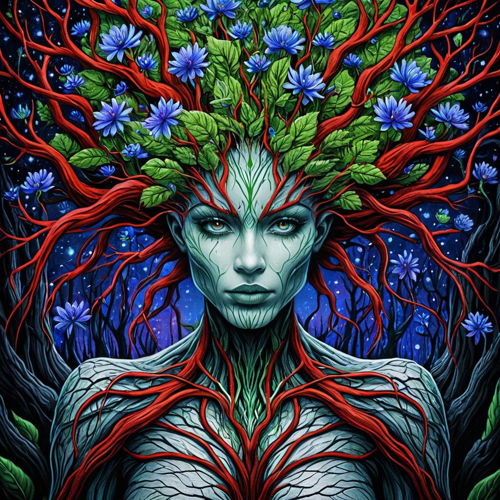 Close-up concept art of an anthropomorphic green tree lady with wild red branches growing from her head like hair, blue and purple flowers, and colorful roots resembling veins across her grey skin body. Set against a magical night background with a surreal and imaginative dreamscape, this detailed and intricate fantasy artwork showcases bold surreal impressionism and alien flora elements.
