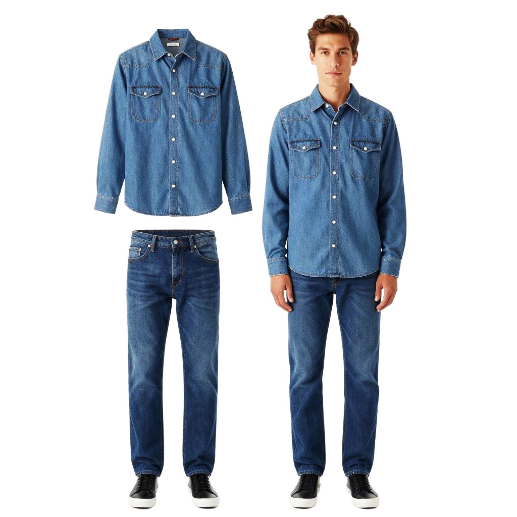 Denim Shirt Combination, man in a blue shirt and jeans posing for a picture