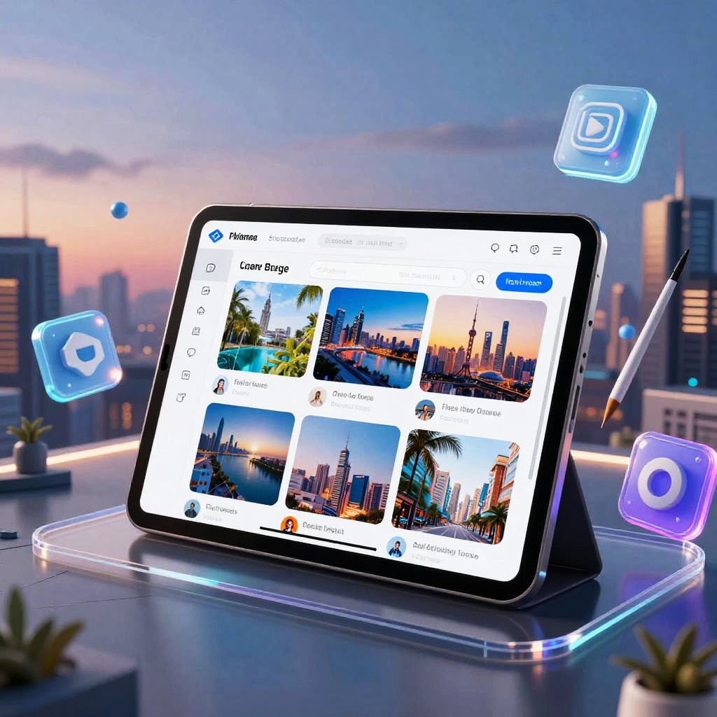 AI image creater free interface displayed on a sleek transparent tablet, surrounded by floating 3D icons and virtual brushes, cyberpunk cityscape at dusk in the background, glowing neon elements, high-tech minimalistic design, vivid and immersive environment