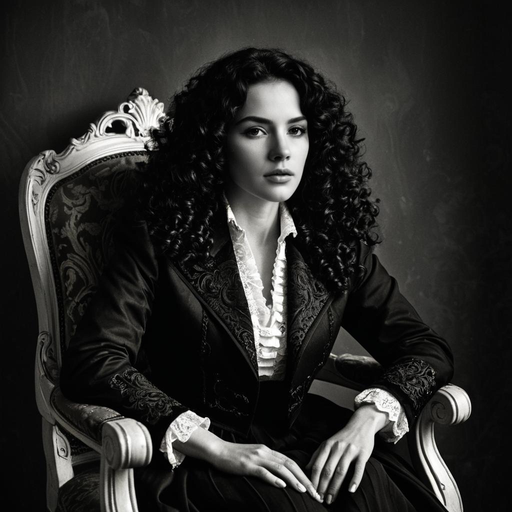 Black and white portrait of a regal woman with long curly dark hair sitting on an ornate wooden chair. She is wearing a vintage black jacket with embroidered details over a white ruffled blouse. The image showcases chiaroscuro lighting that highlights her intense and calm expression and the textures of her clothing, creating a classic oil painting effect. The style is baroque with an elegant and dramatic atmosphere.