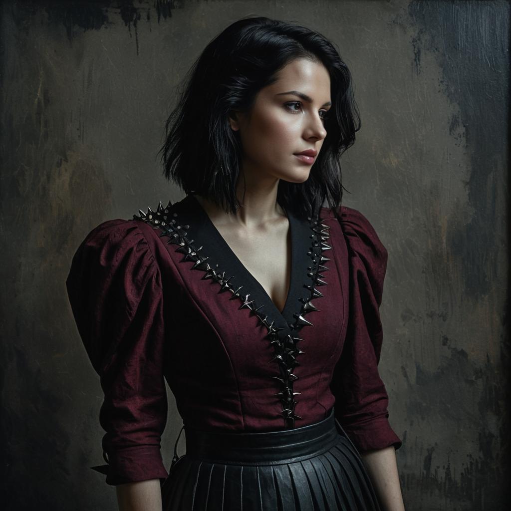 A regal woman sitting on an ornate wooden chair, wearing a vintage black jacket over a white blouse, long curly dark hair cascading around her shoulders, intense and calm expression, baroque style portrait, chiaroscuro lighting emphasizing facial features and textures, classic oil painting look, muted grayscale and sepia color tones, elegant and dramatic atmosphere