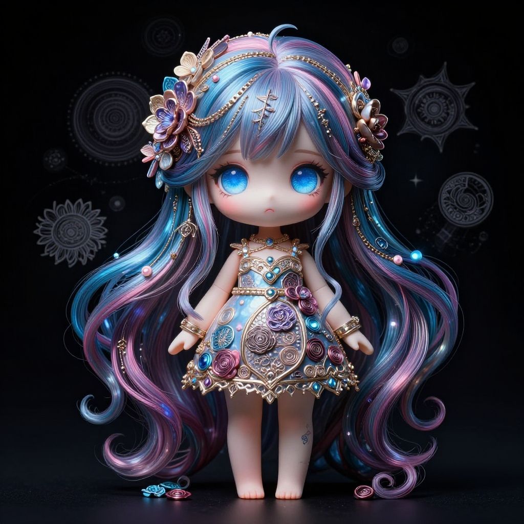 Digital art of a chibi doll with large blue eyes, long, flowing purple and blue hair, adorned with gold and floral accessories, wearing an intricate