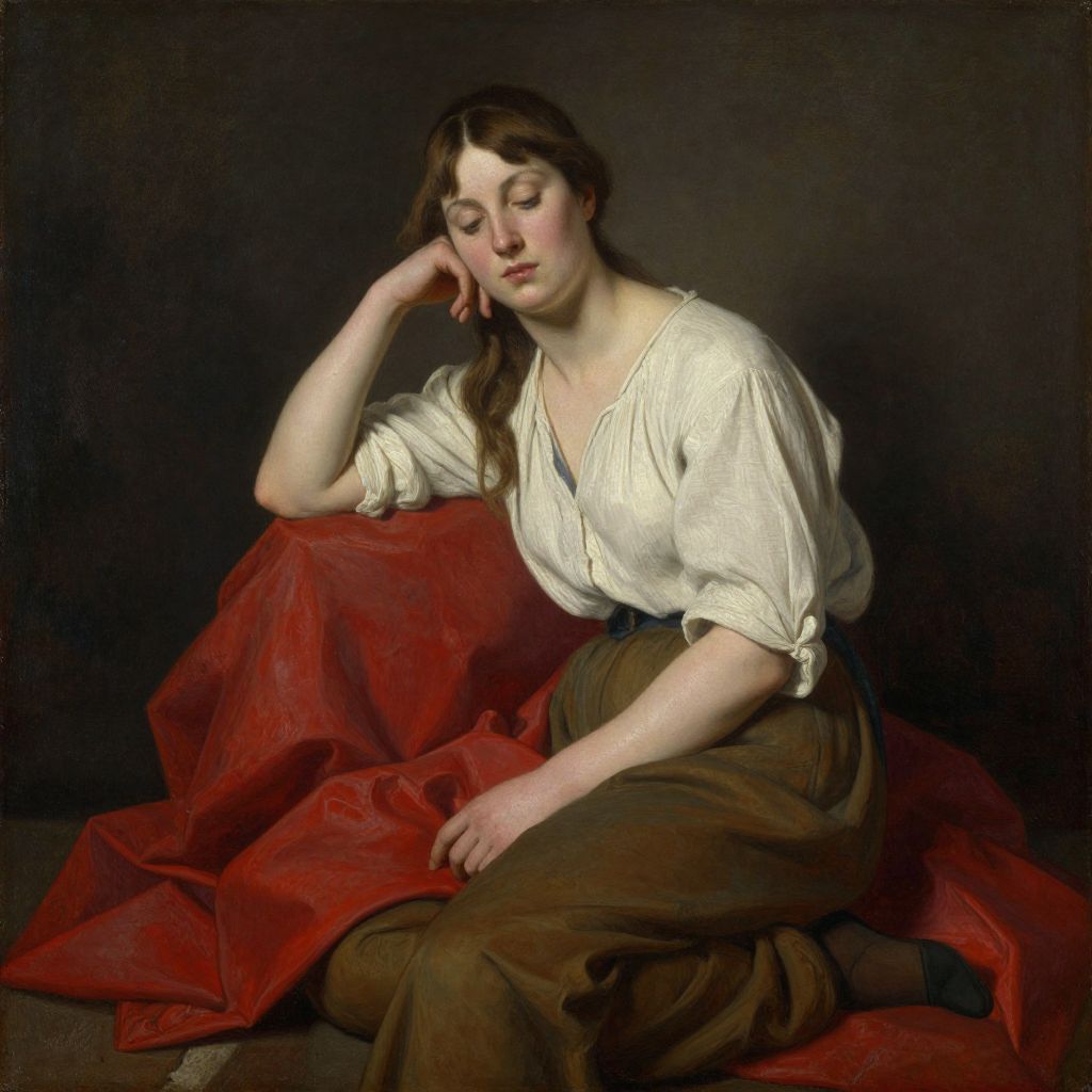 Seated figure in contemplative pose by Charles Amable Lenoir, featuring a woman dressed in a cream blouse and brown trousers, draped with a vibrant red cloth, captured against a dark, textured background.