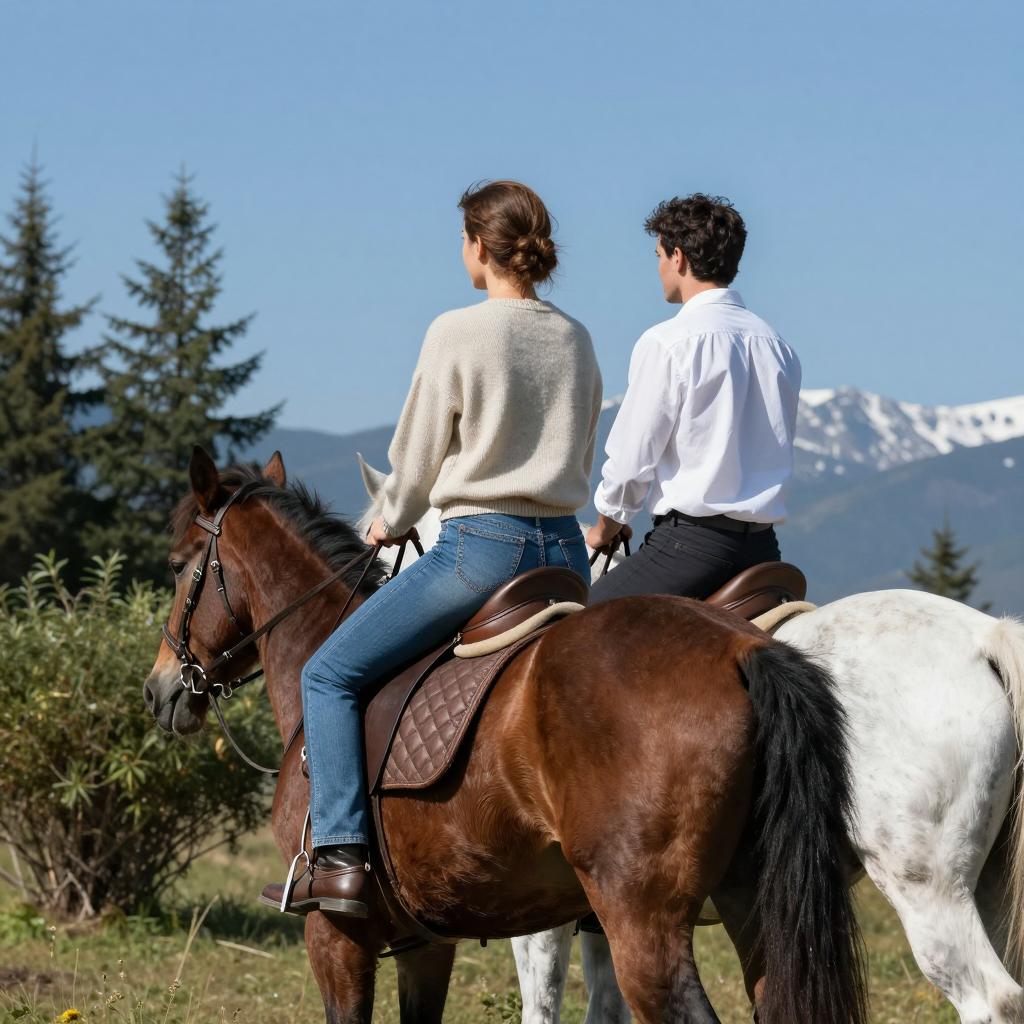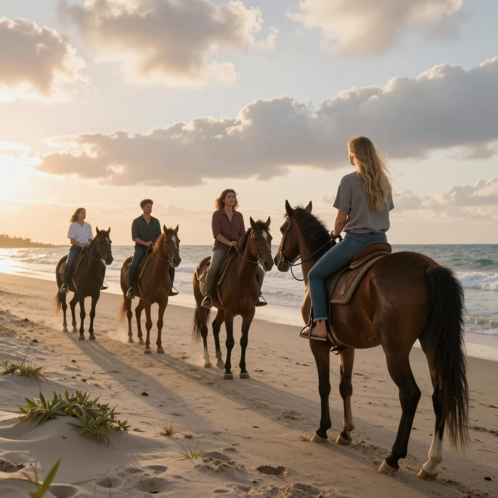 Woman with dark hair in a bun, wearing a black crop top and high-waisted shorts, sitting on a white and brown horse with a green quilted saddle. She faces away, looking at a beach and green hill under a blue sky with a white cloud. Another person stands in the distance on the left.
