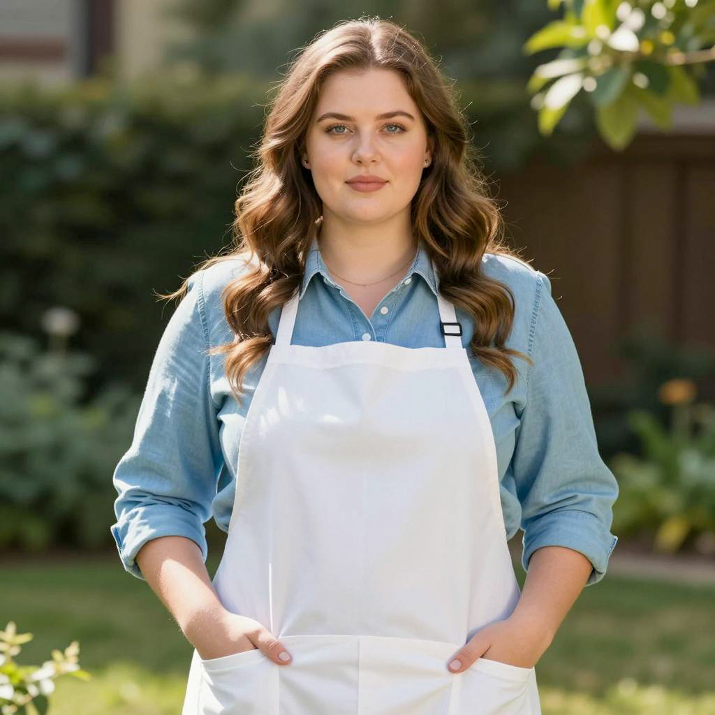 Plus size kansas girl adult, photograph of a plus-size woman, long wavy brown hair, blue eyes, wearing a light blue button-up shirt and white apron, standing outdoors, sunny day, green blurred background with trees and bushes, neutral expression, hands in pockets, realistic style, natural light, casual pose, medium shot