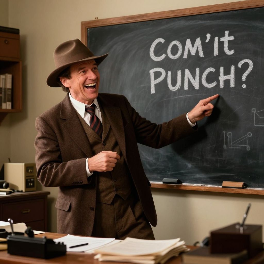 Detective joke image of a detective laughing while revealing a comical punchline on a chalkboard in a cluttered office, retro detective gear, warm lighting, energetic and fun vibe.