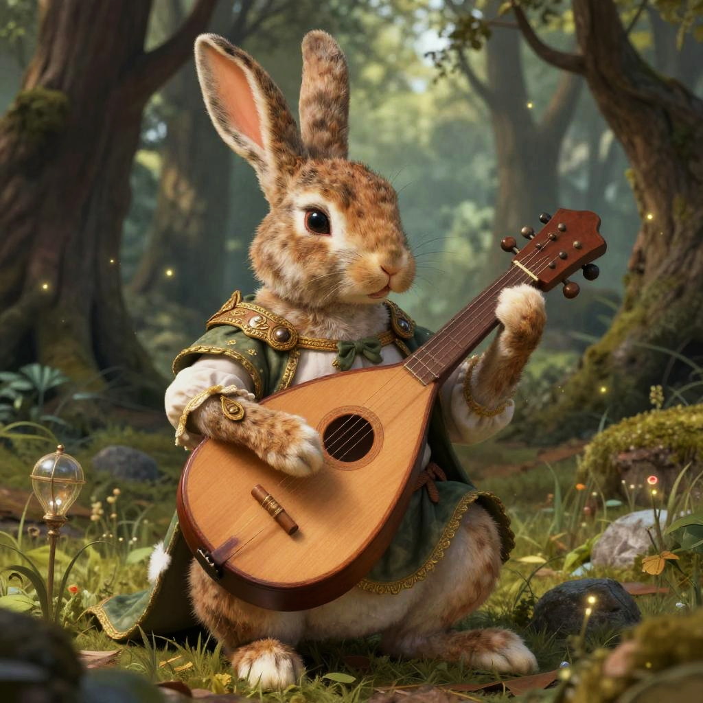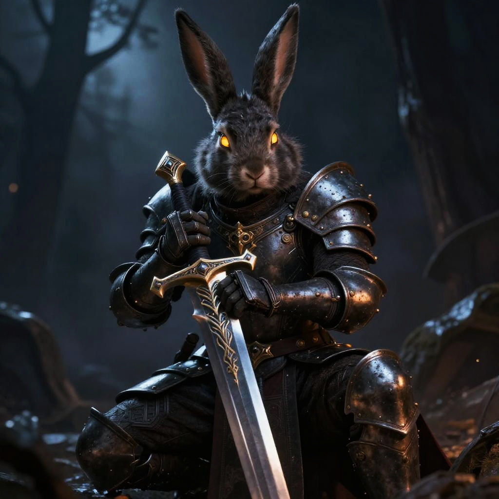 Bunny with sword, heroic fantasy scene, detailed fur texture, epic battle stance, glowing sword, mystical forest background, high resolution, vibrant colors