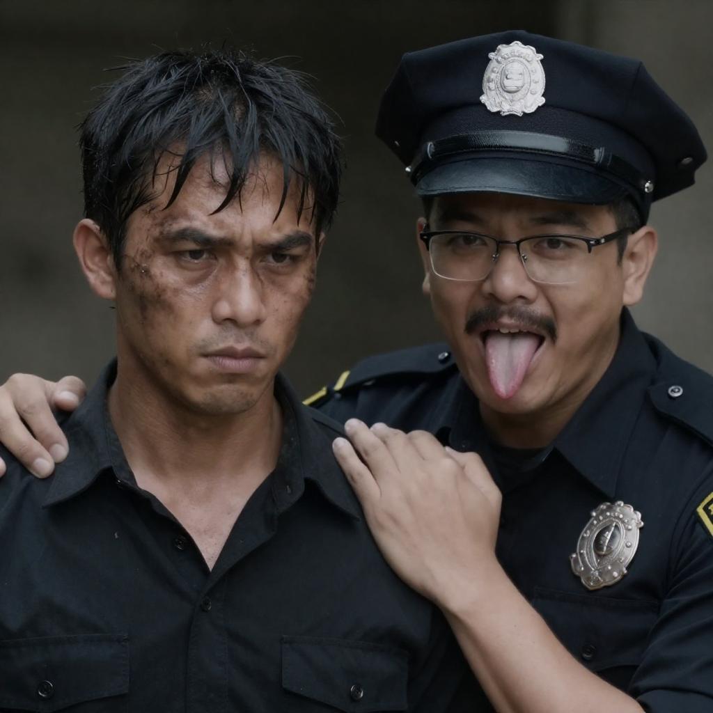 Close-up photograph of a battered young man with short, dark, wet hair, blood on his face and forehead, intense expression, looking to the right. Dimly lit background with dark bars partially obscuring the view. Military-style green uniform. Single subject.