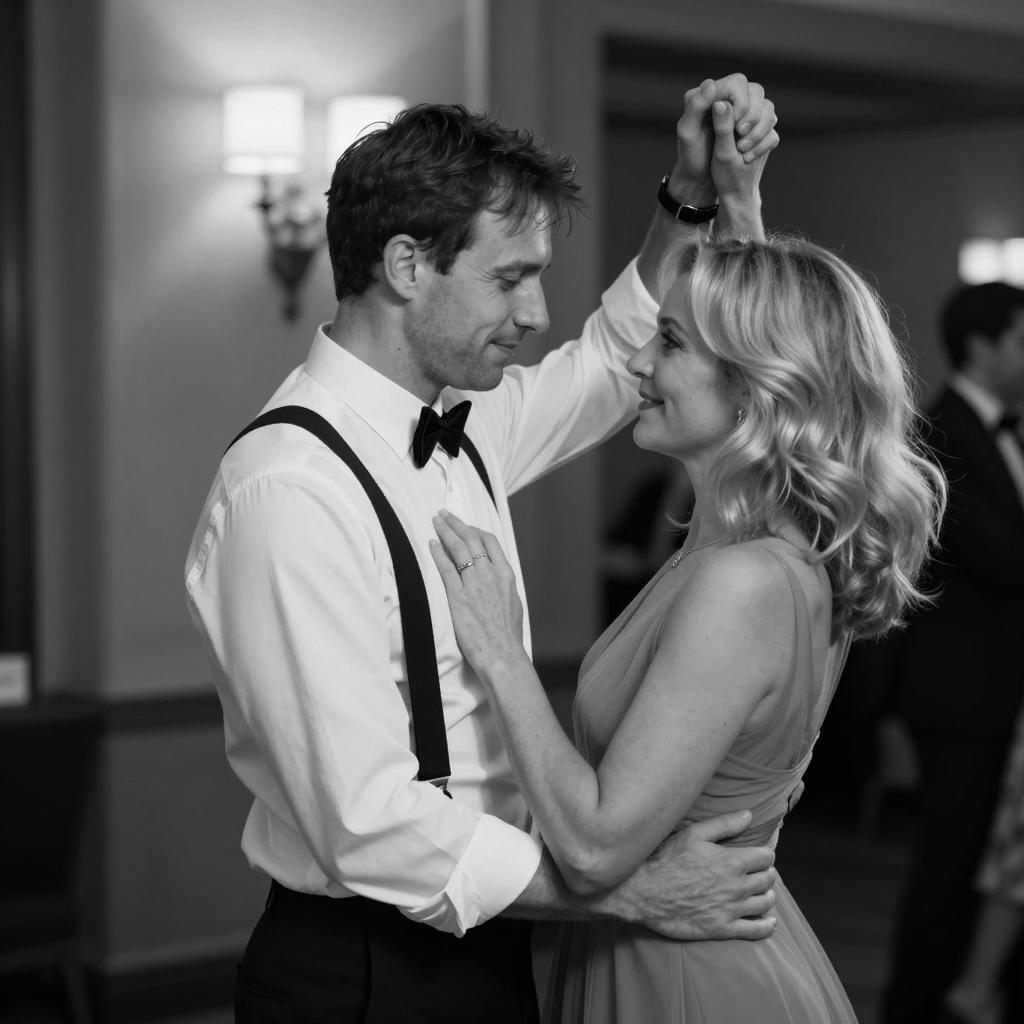 Man and woman dancing in an indoor setting with blurred city lights in the background. Man has short brown hair, wears a black suit, smiles broadly. Woman has light brown hair, wears a black dress, smiles widely. Both have arms around each other. Blurred lights create a bokeh effect. Both facing each other, slightly angled to the left.