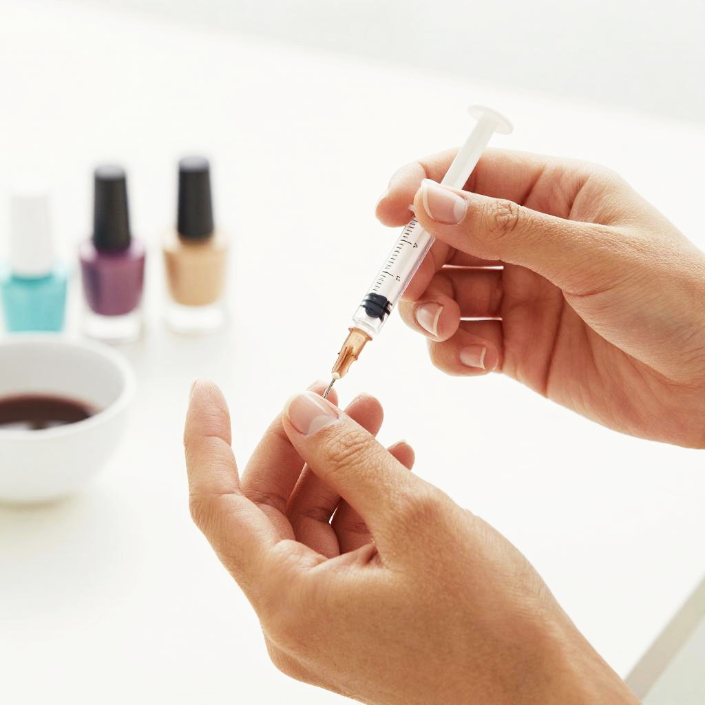 A close-up photo shows a person's hands applying nail polish to their index finger. The nails are neatly manicured and painted with a light pink polish. The person's hands have a light skin tone and are holding a black nail polish brush with a small, clear bottle of nail polish. The background is blurry with soft, white and gray tones. The image has a bright, slightly over-exposed quality.