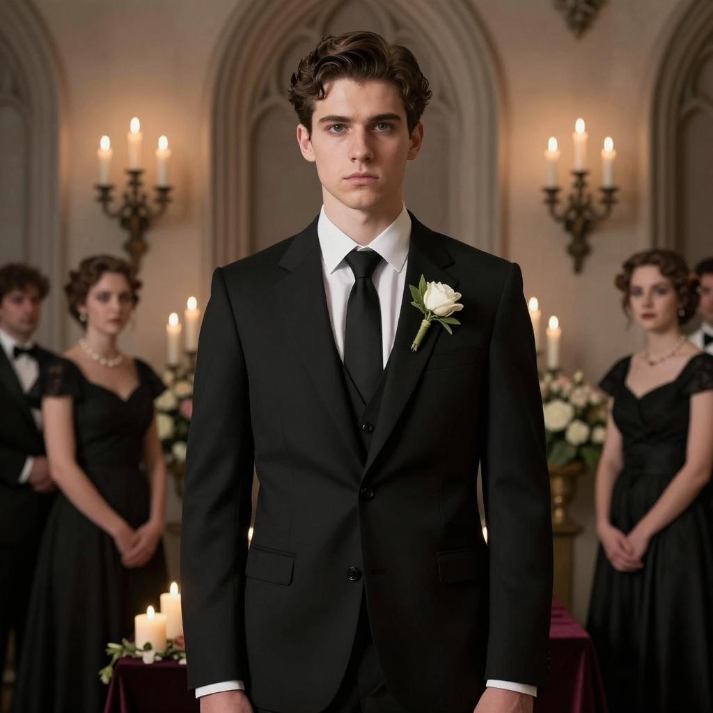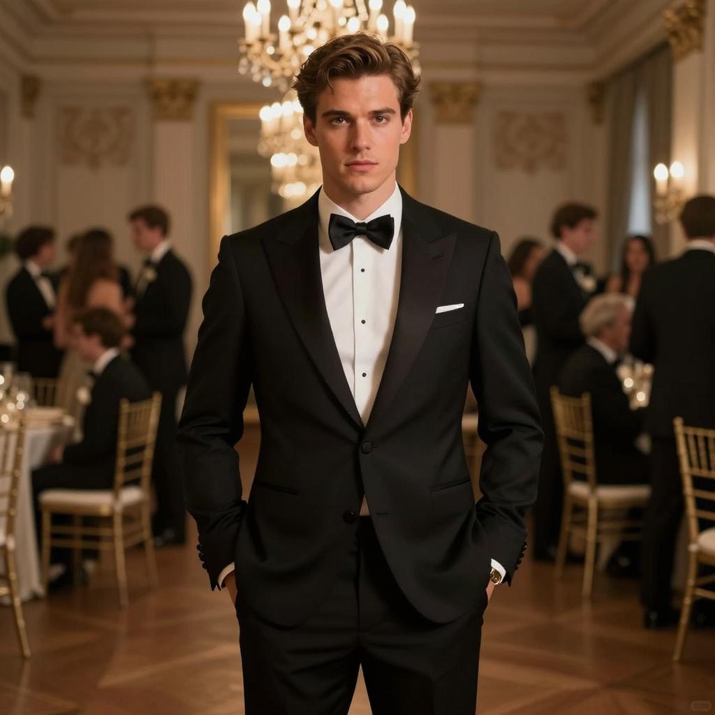 A young man with brown hair wearing a black tuxedo with a white shirt and black bow tie, standing confidently with hands in pockets in a dimly lit, elegant ballroom. The background shows people dressed in formal attire, chandeliers, and a polished wooden floor, emphasizing a high-class evening semi-formal event.