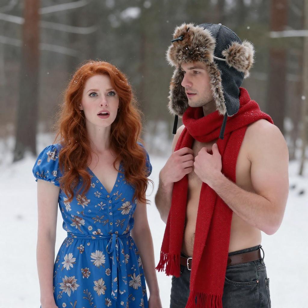 Photograph of a red-haired woman in a blue floral dress and a shirtless man with a furry hat and red scarf standing in a snowy forest. Snowflakes fall around them, and the woman looks surprised while the man adjusts his scarf.