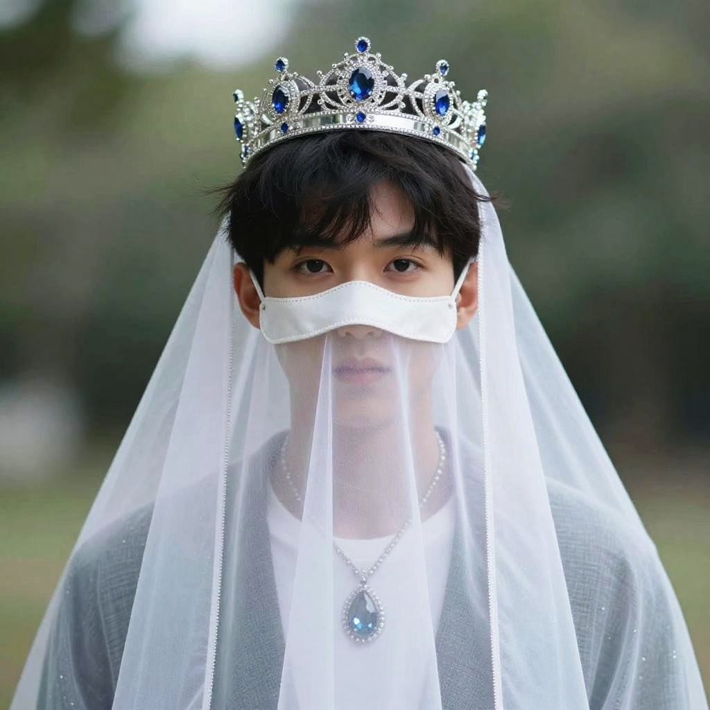 Solo, veil, necklace, jewelry, 1boy, male focus, mask, looking at viewer, mouth mask, crown, upper body, covered mouth, blurry, portrait, mouth veil, black hair, blurry background