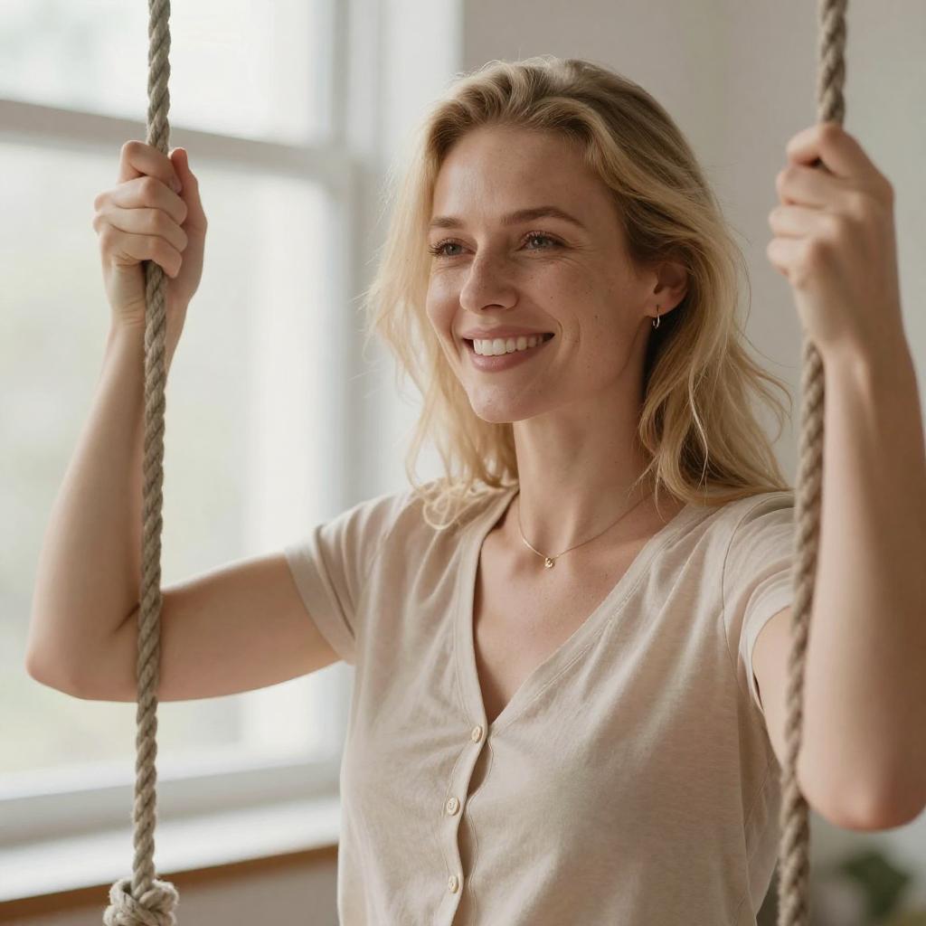 Photograph of a smiling blonde woman with light skin, wearing a beige short-sleeved shirt, holding a rope swing with both hands. She stands indoors against a bright, blurred window background, with soft natural light illuminating her face.