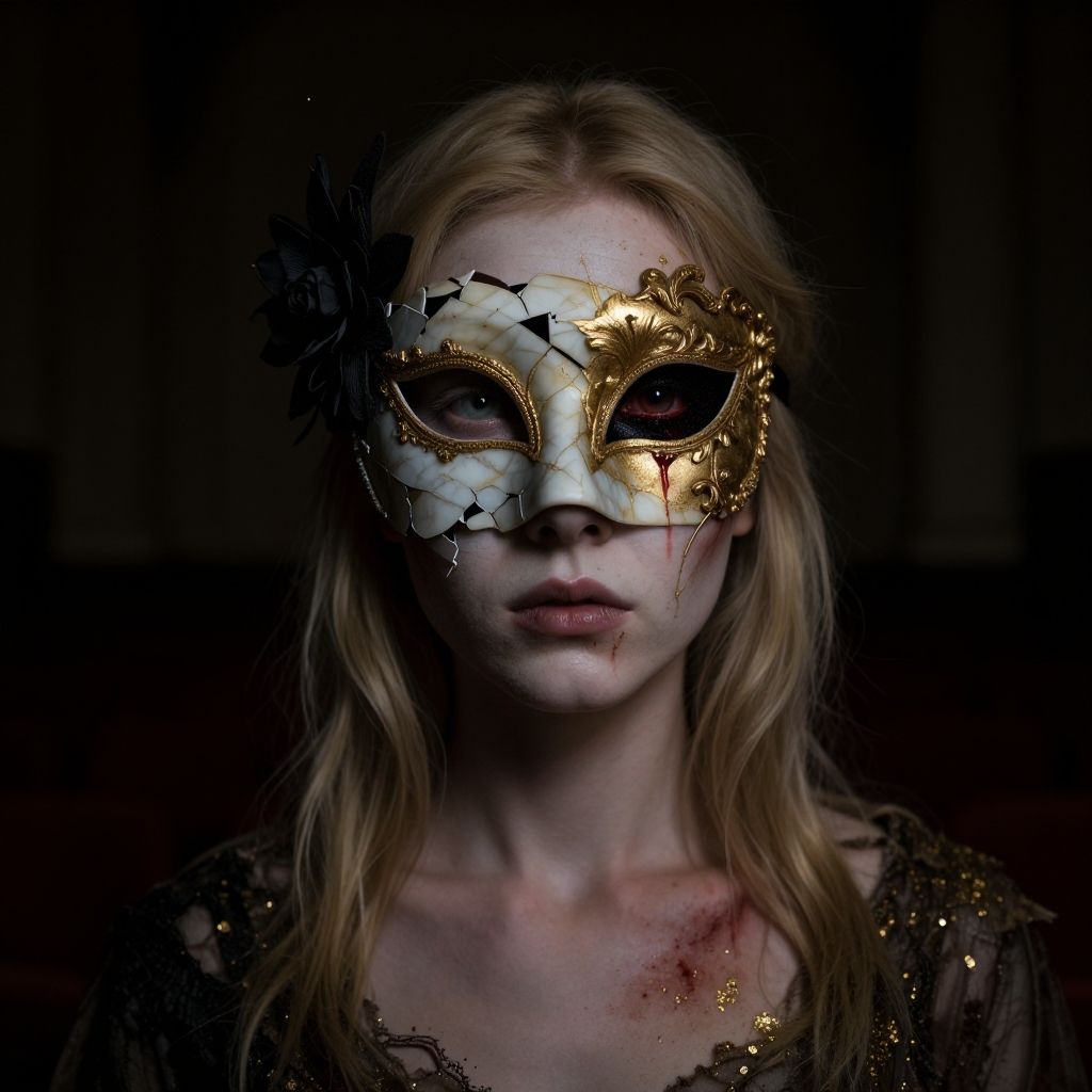 In a dimly lit, atmospheric room, a mysterious blonde girl stands with a fragmented marble masquerade mask adorning her face. The mask, edged with ornate gold filigree, reveals a partial glimpse of her hauntingly beautiful features. Its shattered form, with sharp, jigsaw-like breaks, catches the sparse light, creating a chiaroscuro effect that dances across her skin. The golden veins that traverse the mask seem almost to pulse with life, giving the image a surreal, otherworldly quality. The girl's disheveled yet elegant attire, with tattered edges and dusted in gold leaf, speaks of a tragic elegance. The background fades into shadow, ensuring all focus is on the enigmatic figure and her mask, a symbol of both concealment and fragile beauty., Dark and gritty, epic scene, dramatic lighting, cinematic, pale skin, imperfections, (8K resolution), establishing shot, high textures, leica, subsurface scattering, CINEMATIC, MOVIE STILL, CHROMATIC ABERRATION, REALISTIC, amazing, intricate, artistic, extremely inspirational, with gold leaf, one eye visible, cracked porcelain makeup, blonde hair, serious expression, carbone black fenix, lava spiral, particle, Reflective eyes, Cut lips, tanding in a dark auditorium, partial face mask, marble mask, half mask, half-mask, broken mask, shattered, (golden veins:0.6), textured skin, masquerade . low light, dark, ominous, backlighting, red and black void tears, red right