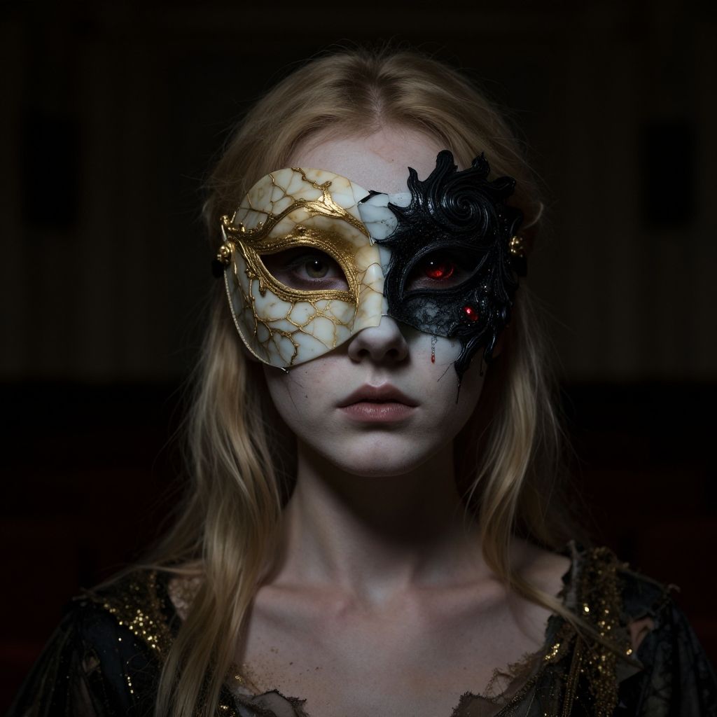 Photograph of a young white woman with pale skin and long blonde hair, wearing a dramatic Venetian mask. The mask is split into two halves: the left side is gold with intricate crackled patterns, while the right side is black with red eyes and a gothic lace design. She has a neutral expression and is dressed in a black lace top. The background is dark, emphasizing the contrast between the mask and her face. The lighting is low, creating a mysterious and slightly eerie atmosphere.