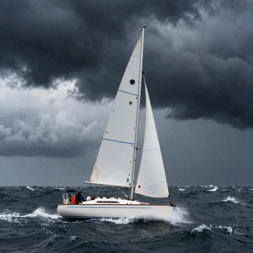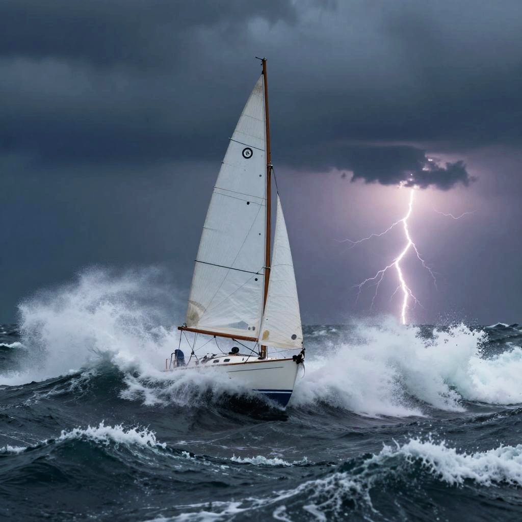 A sailboat navigating rough and turbulent ocean waves under a dark, stormy sky. Intense wind fills the boat's white sails as a flash of lightning illuminates the cloudy horizon in the distance. The scene captures the dramatic and dynamic elements of a challenging sea voyage during severe weather conditions.