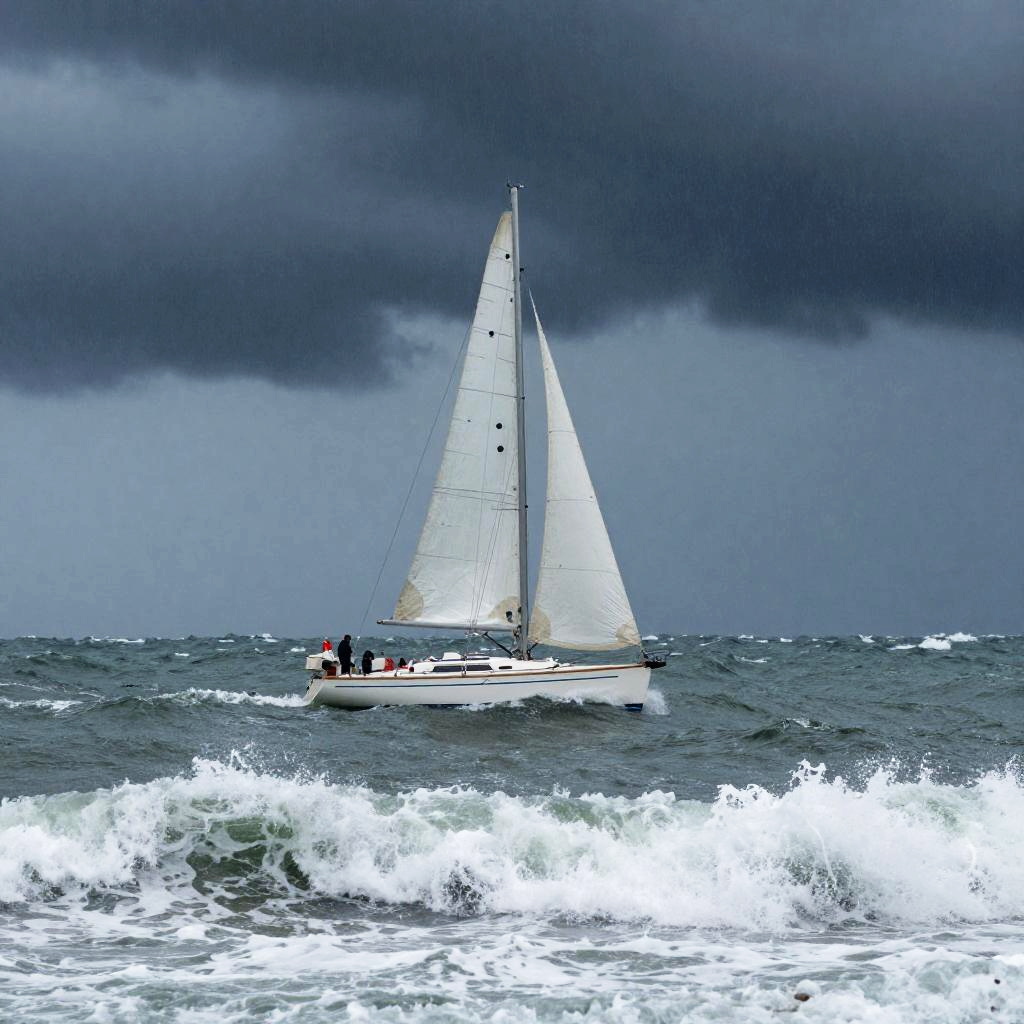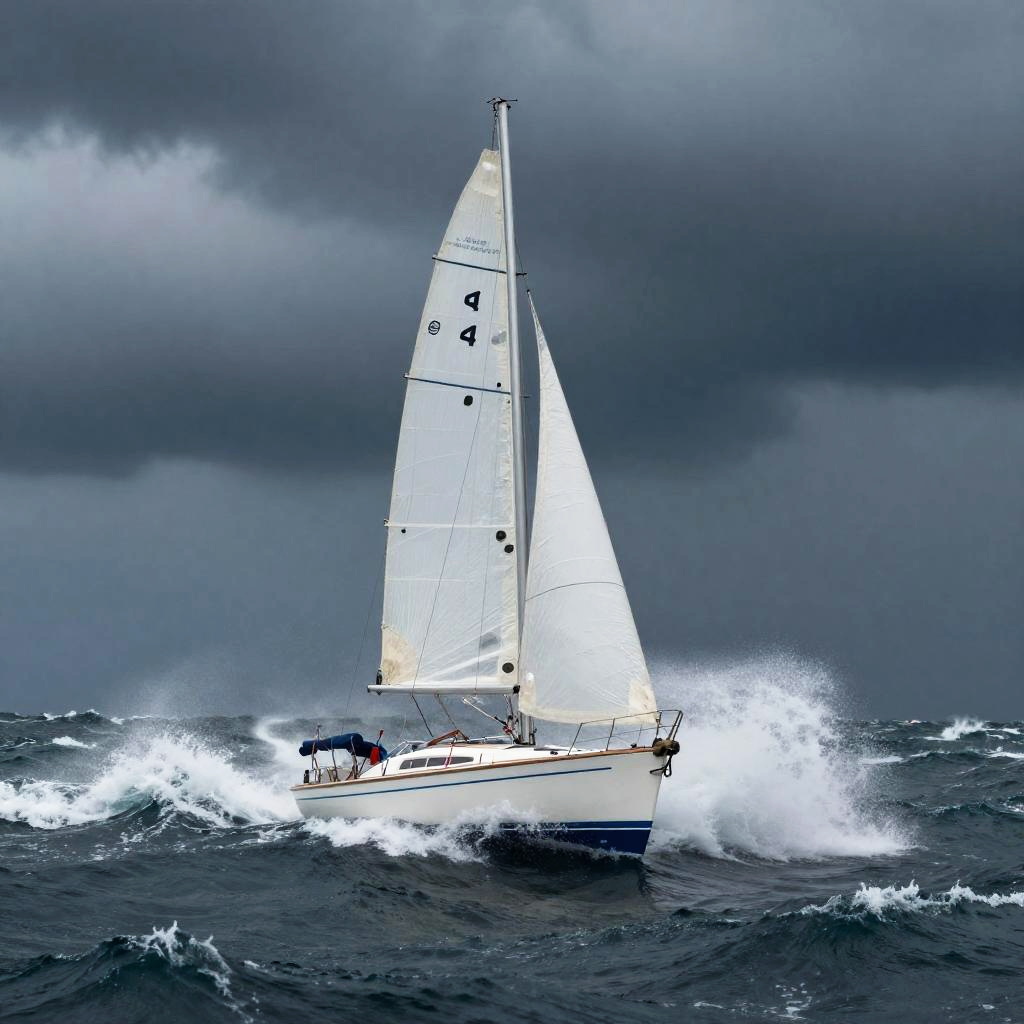 Sailboat in stormy seas battling towering waves under a dark, overcast sky, intense wind blowing, lightning flashing in the distance, dramatic and dynamic scene with churning ocean and cloudy atmosphere, high detail, cinematic lighting.