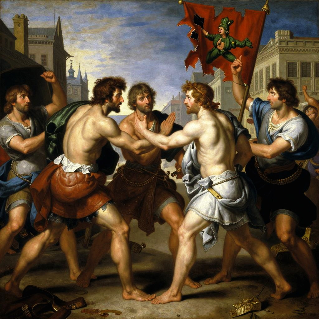 Baroque-style painting of six muscular, shirtless men with varying hair and beards, fighting and holding red flags, set in a historic cityscape