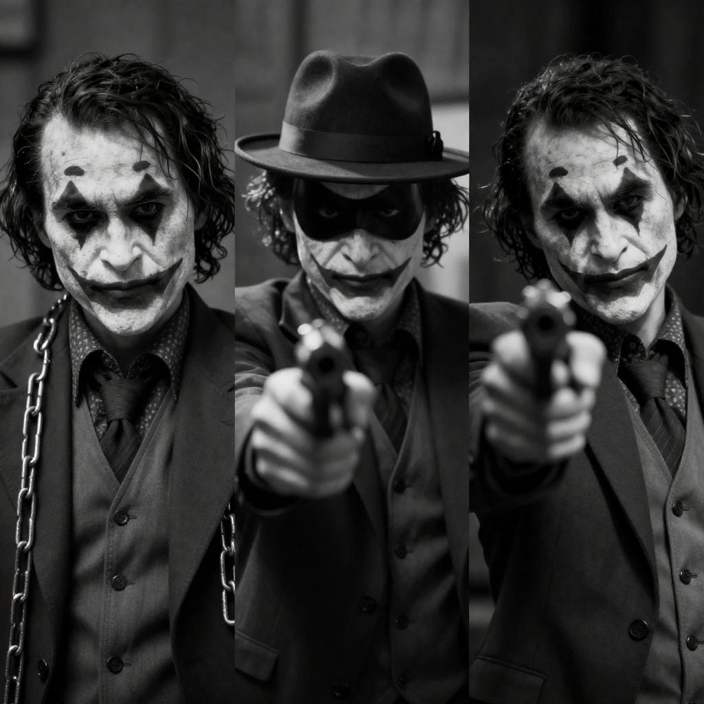 Black and white triptych of the Joker in a film noir style. Three close-up shots: Joker with chains in left, wearing a hat and mask in center, pointing a gun in right. Intense expressions. Dark, gritty background. Three distinct poses.