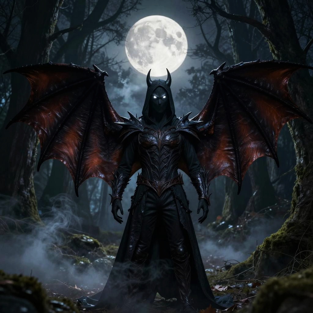 Bat wings costume displayed on a dark mysterious figure standing in a moonlit gothic forest, glowing eyes piercing the night, intricate leathery wings spread wide, detailed textures, eerie atmosphere with mist swirling around ancient trees, high contrast lighting.