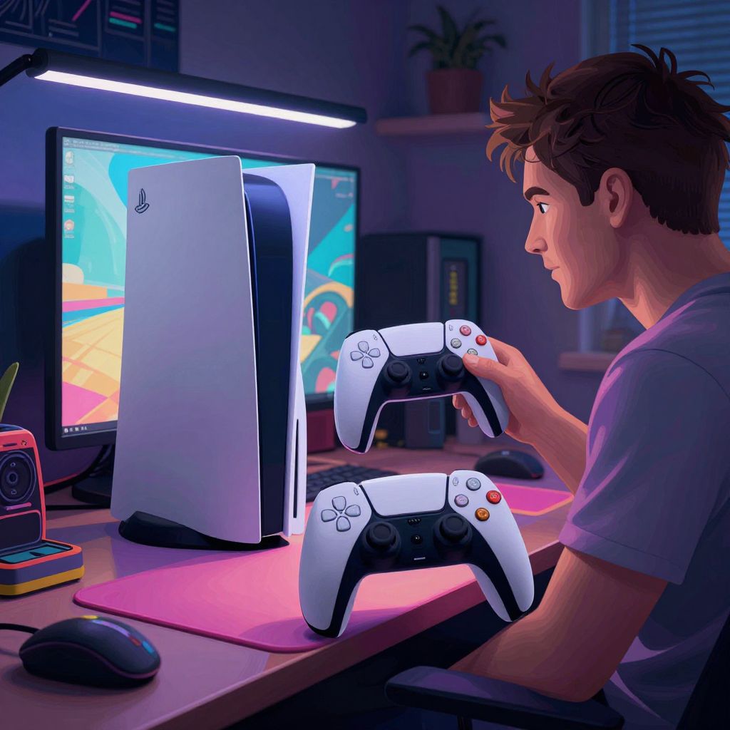 Video gamecore, gamecore, gamercore pop art of a man playin playstation 5 on his bedroom at night, cinematic perspective, studio ghibli, pop art, trending in artstation, behance, deviantart