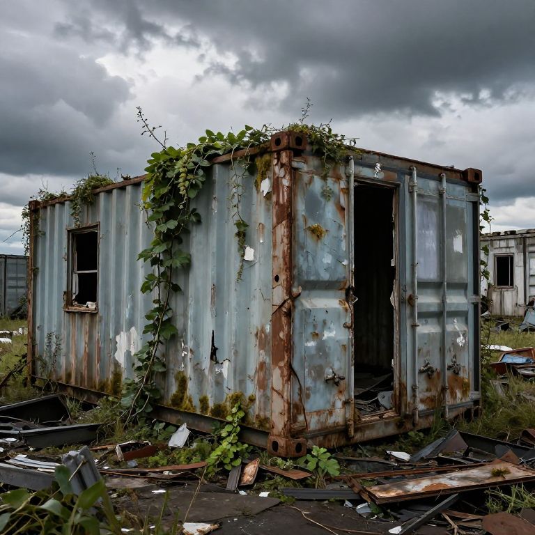 Abandoned Conex containers in a post-apocalyptic wasteland, overgrown with vines and moss, cracked metal surfaces and broken doors, dramatic cloudy sky overhead, remnants of civilization scattered around, highly detailed textures and moody lighting.