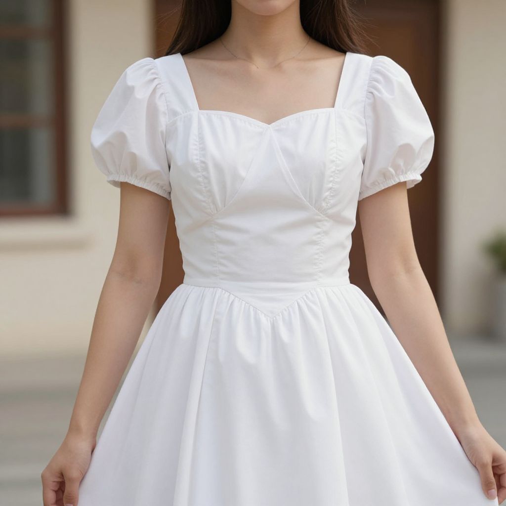Photograph of a young woman from the chest down, wearing a white, square-neck, puffed-sleeve, knee-length dress with a cinched waist. The dress has a simple, elegant design with a slight sheen to the fabric. Her long, dark brown hair is straight and falls past her shoulders. The background is slightly blurred, featuring a beige wall with a dark brown window frame to the left and a door to the right. The image has a soft, natural light, highlighting the purity and simplicity of the white dress.