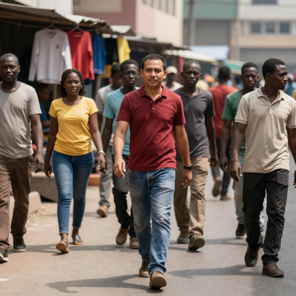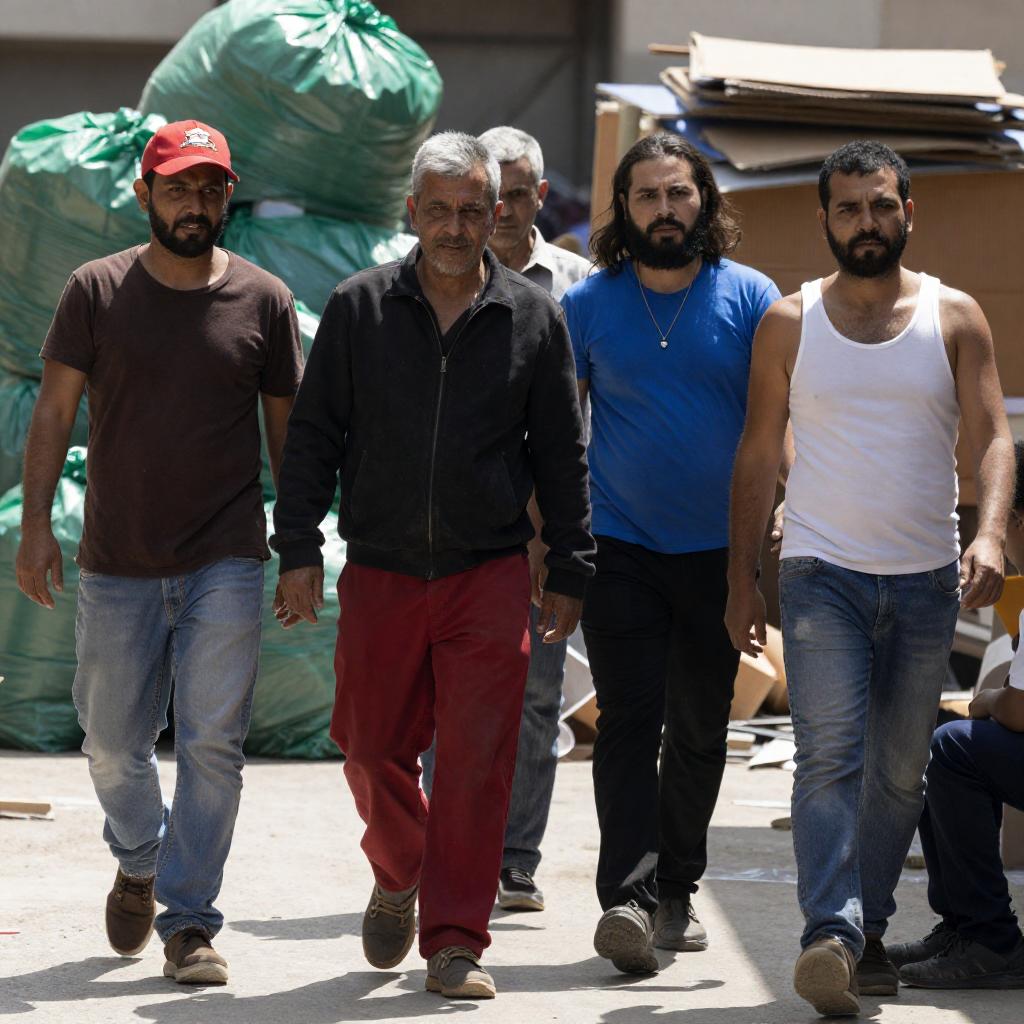 Photograph of five men walking outdoors in a cluttered, urban area. Men have diverse appearances: one with red cap, brown shirt, jeans; another with gray hair, black jacket, red pants; third with beard, long hair, blue shirt, necklace; fourth with white tank top, jeans; fifth partially visible, sitting. Background has green plastic bags, cardboard, and construction materials. Sunlight casts shadows. Intense expressions visible on some faces.