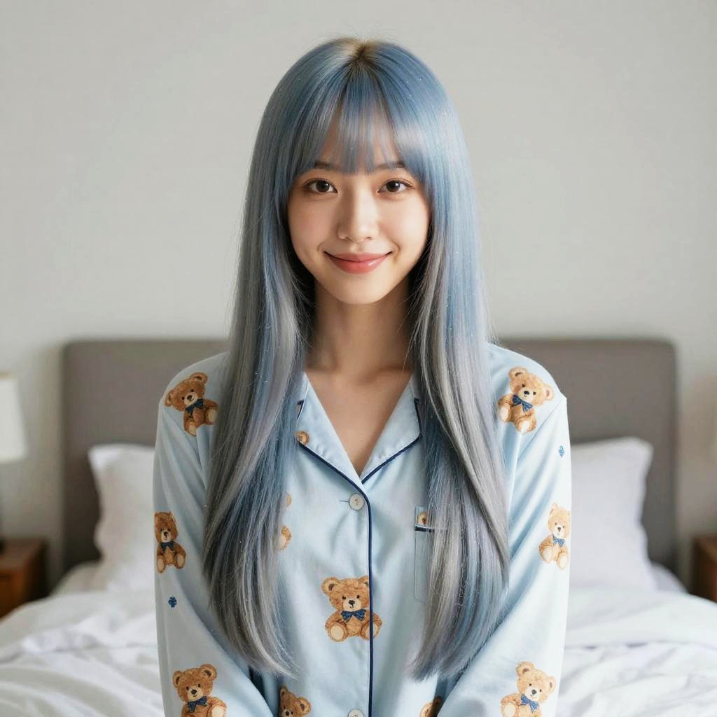 Photograph of an Asian woman with long, straight, silver-blue hair and bangs, smiling softly at the camera. She is wearing a light blue pajama top adorned with brown teddy bear prints. Her skin is smooth and fair. The background features a blurred, light-colored bedroom with a bed and white pillows. Natural light illuminates the scene, creating a gentle, warm atmosphere. The overall style is casual and cozy, emphasizing a relaxed, homey setting.
