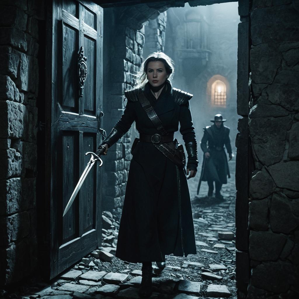 A brave and curious soul named Hazel disregarded the villagers' warnings and ventured into the crumbling fortress. Moonless night, armed with a silver dagger, pushing open the creaking door, greeted by a chilling gust of wind. cinematic, 4k, Steven Spielberg movie still, sharp focus, emitting diodes, smoke, artillery sparks, by Artgerm, H.R. Giger, hyperrealism painting, concept art, detailed character design, matte painting, 4k resolution, Blade Runner aesthetic