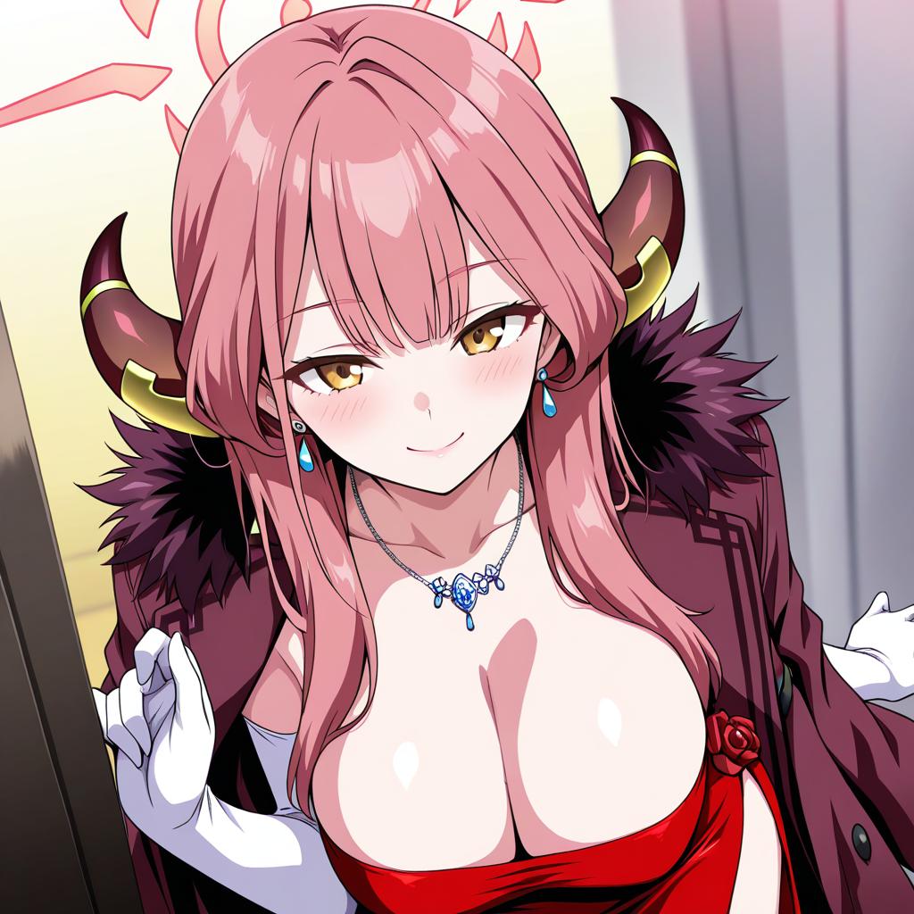 Aru (dress) (blue archive), blue archive, 1girl, demon horns, brown horns, yellow eyes, pink hair, long hair, red hair, large breasts, cleavage, collarbone, red dress, white gloves, coat on shoulders, strapless dress, elbow gloves, red coat, jacket on shoulders, halo, pink halo, earrings, necklace, side slit, by artist marugoshi teppei, illustrious