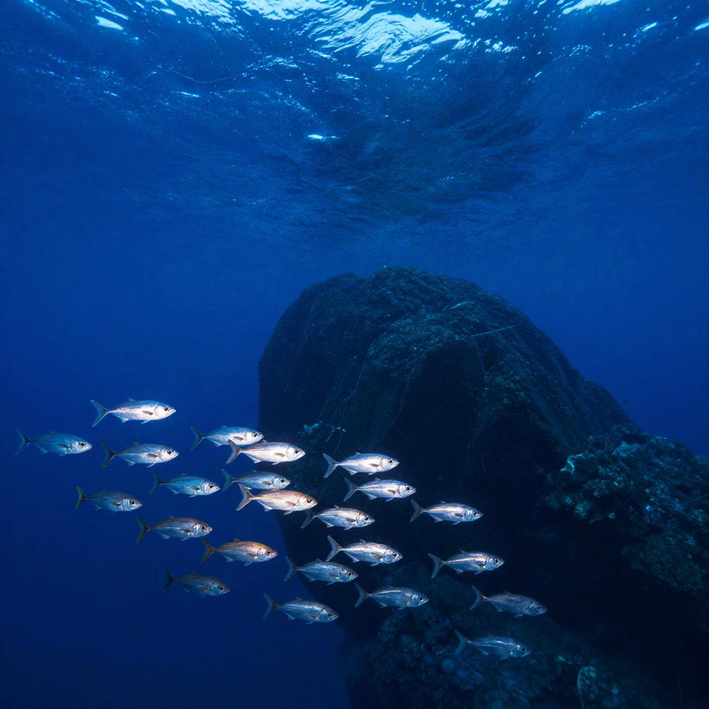 A surreal seascape dominated by deep ocean blue color, capturing vast expanses of the deep sea with gentle waves above, contrasted by powerful sea currents below driving schools of shimmering silver fish and huge underwater mountains draped in blue hues.