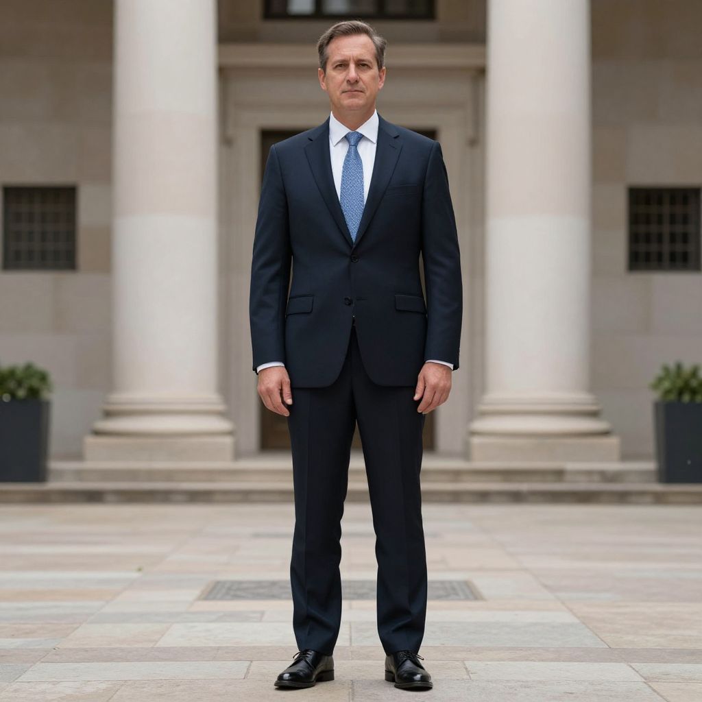 Photograph of a middle-aged man in a dark navy suit, white shirt, and blue tie, standing in front of a neoclassical building