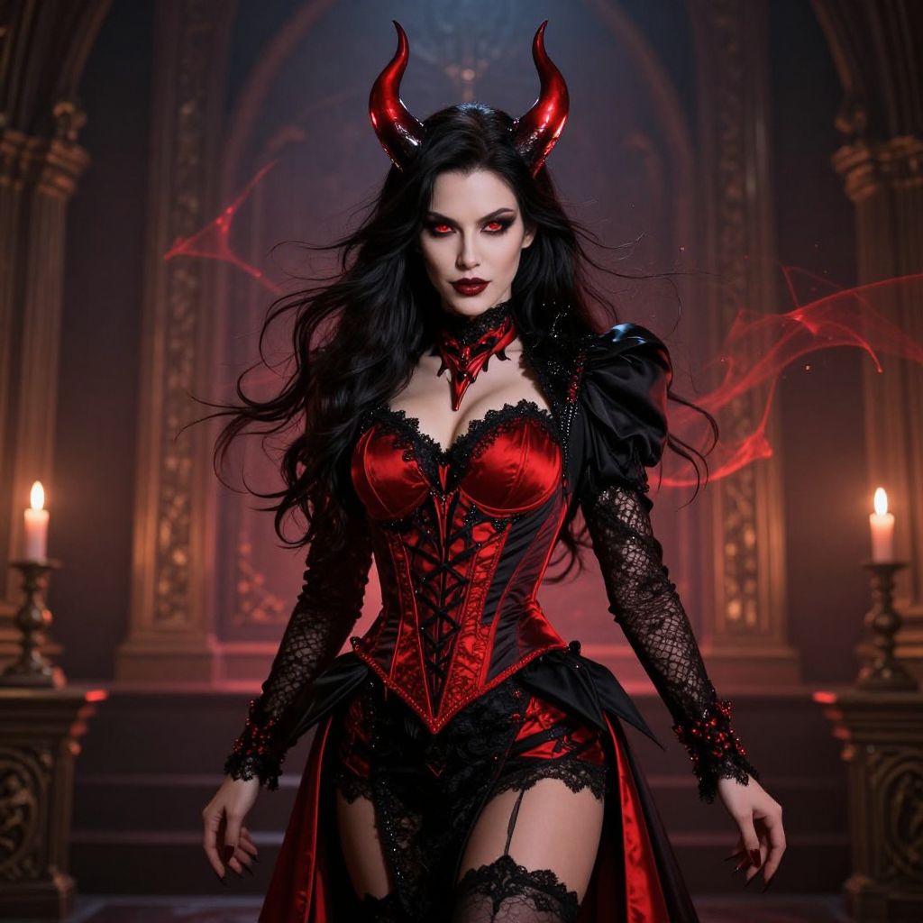 A woman with long, flowing dark hair and an elegant yet menacing devil costume featuring sharp, red horns rising from her head, glowing crimson eyes, and a sleek, tailored outfit with black lace and crimson accents. She stands confidently in a dimly lit, gothic-themed room with a faint aura of magic surrounding her, exuding a mix of allure and supernatural power. The atmosphere is mysterious and cinematic, with soft shadows and candlelight casting dramatic highlights on her form.