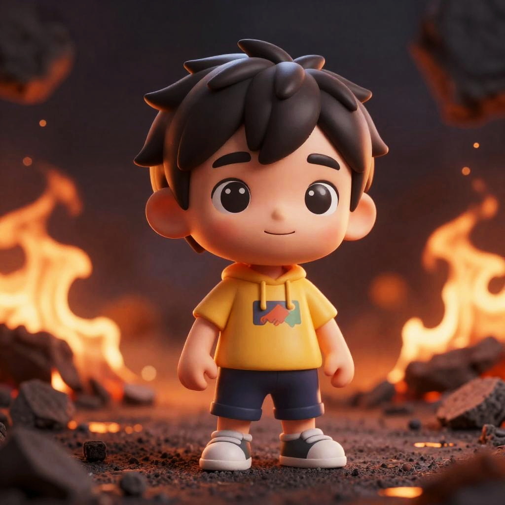 3D illustration of a cartoon-style young boy character with large eyes, black hair, wearing a yellow hoodie, blue shorts, and sneakers. The background features fiery flames and dark ash-covered ground, creating an intense and dramatic scene with vivid colors and detailed lighting effects.